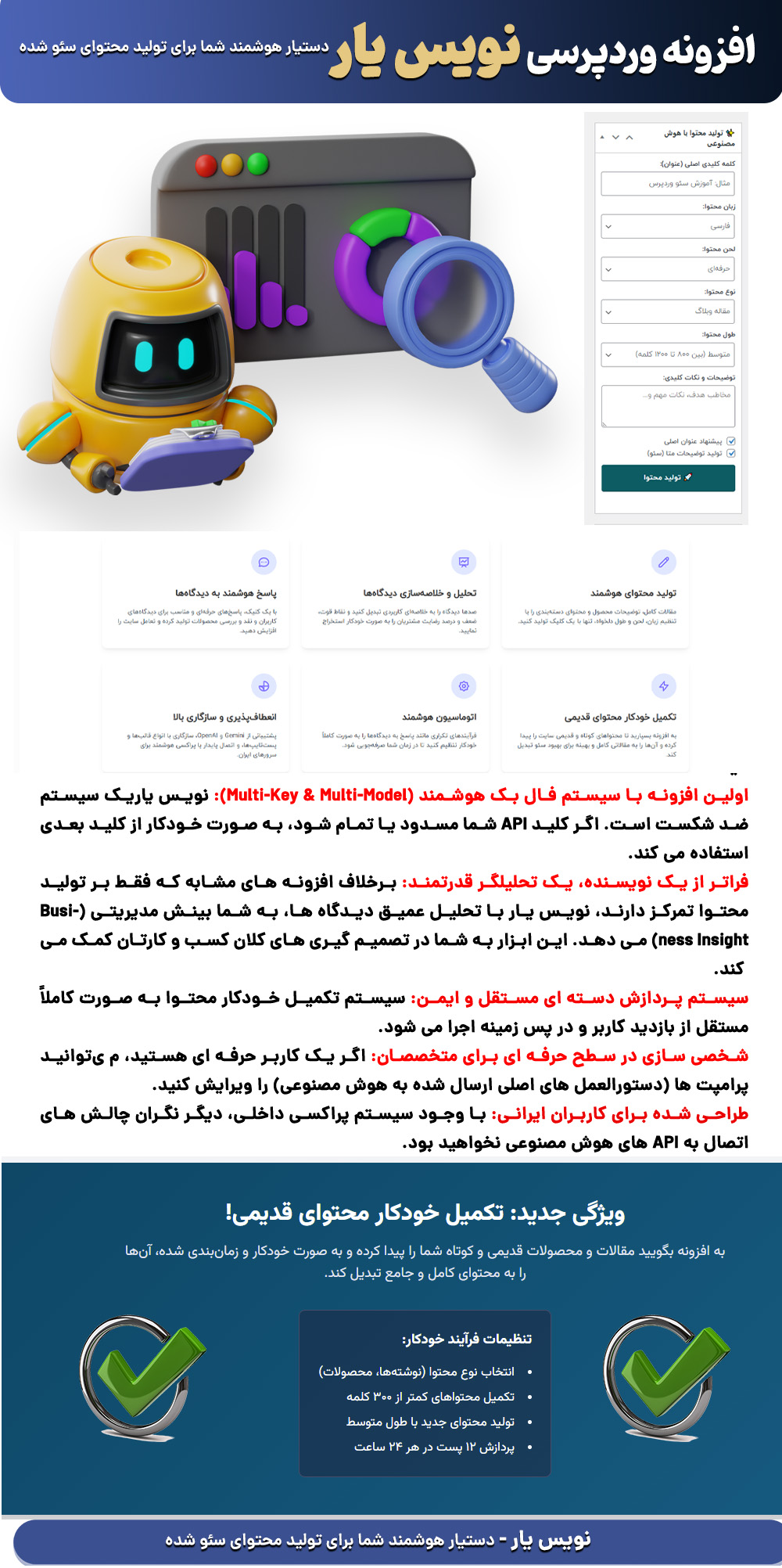 - فراتر از یک نویسنده، یک تحلیلگر قدرتمند: برخلاف افزونه های مشابه، نویس یار با تحلیل عمیق دیدگاه ها، به شما بینش مدیریتی (Business Insight) می دهد.